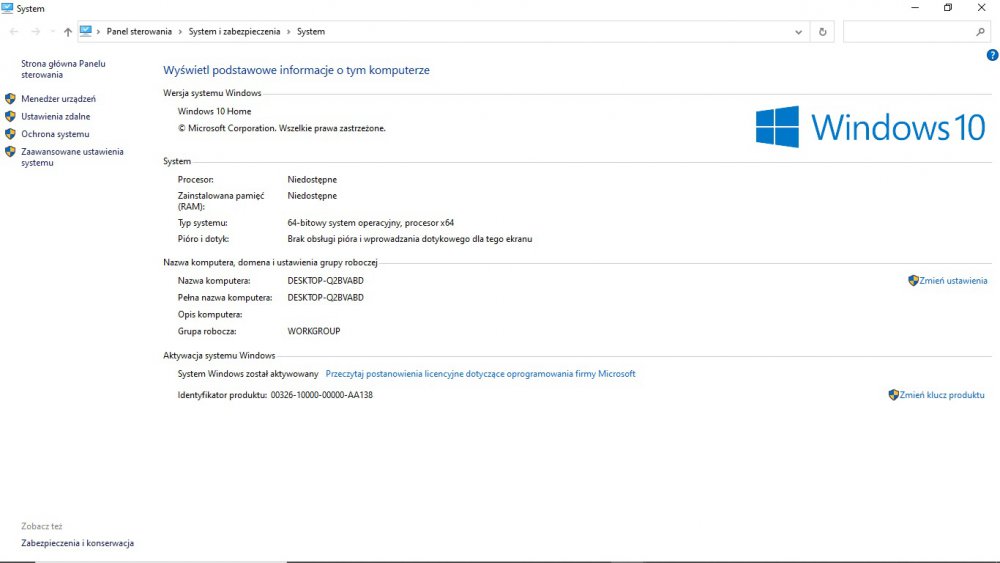 O dziwo dodatkowo teraz w zakladce System w Panelu Sterowania informacje o procesorze czy karcie pamięci figurują jako "Niedostępne".