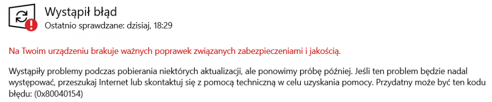 4. Witam. Nie mogę zainstalować aktualizacji WIndows. Przy próbie instalacji pojawia się komunikat: oraz Wykorzystanie narzędzia Windows10Upgrade9252: a MediaCreationTool22H2 "Aktualizacja systemu Windows 10 nie powiodła się" Narzędzie: sfc /scannow - Windows Resource Protection could not start the repair service. (usługa Trustinstaller włączona) Narzędzie: dism /online /cleanup-image /restorehealth Deployment Image Servicing and Management tool Version: 10.0.19041.844 Image Version: 10.0.19045.2193 Error: 0x80040154 Klasa niezarejestrowana. The DISM log file can be found at C:\WINDOWS\Logs\DISM\dism.log Proszę o pomoc. Może ktoś ma jakieś pomysły. Dzięki