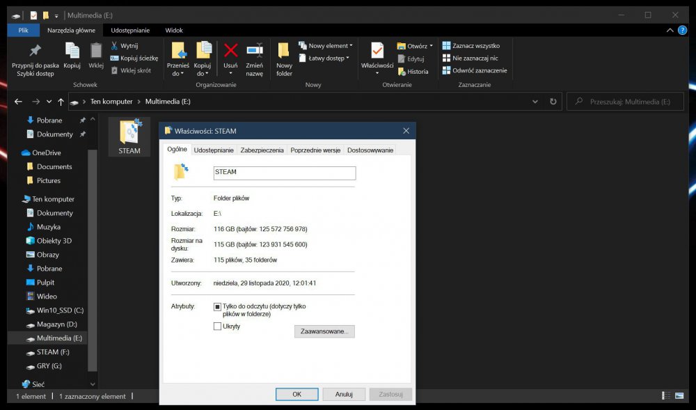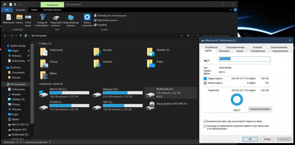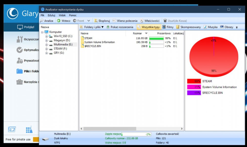 Cześć Posiadam dysk twardy Samsunga podzielony na dwie partycje - D:\ oraz E:\ Partycja E:\ posiada pojemność 232,88GB. Na tej partycji posiadam jeden katalog - E:\STEAM. System Windows 10 jak i program Glary Utilites pokazują, iż zawiera on 116,95GB danych. System oraz oprogramowanie informuje mnie, że dysk mam pełny. Gdzie znikła przestrzeń dyskowa o wielkości 115,93GB i jak ją przywrócić?