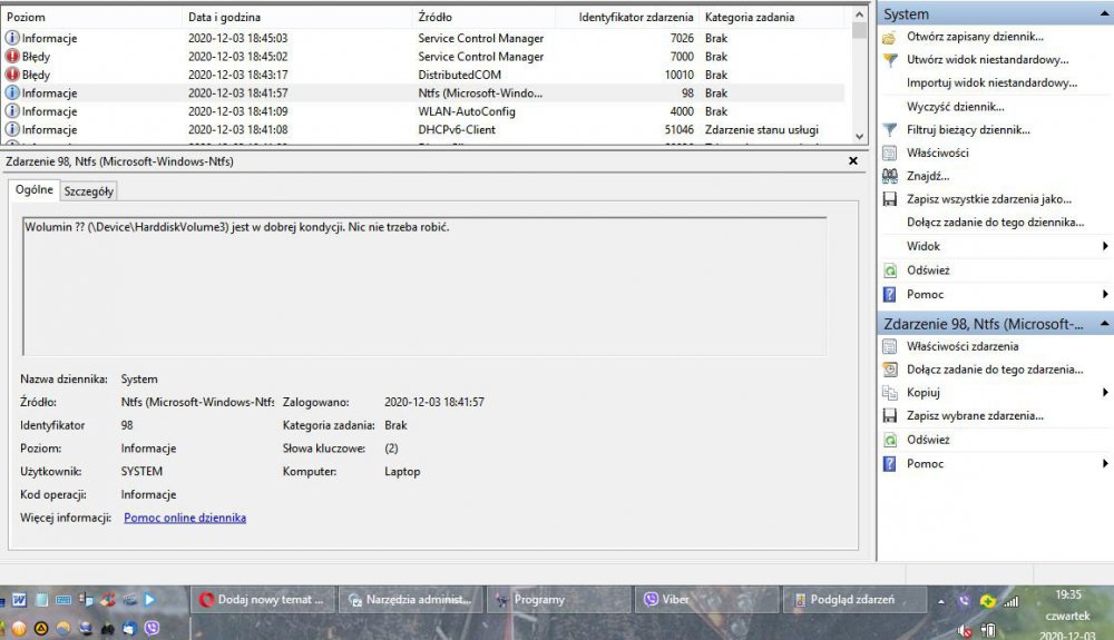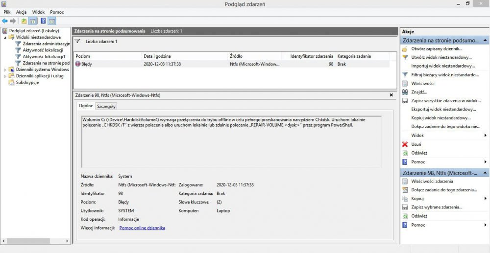 Hejka! Mam problem z dyskiem twardym. Dwa tygodnie temu probówałam zaktualizować masowo sterowniki do laptopa, w efekcie czego nie udało mi się już podnieść systemu - przy ekranie logo firmy, za każdym razem pojawiał się dopisek "trwa próba naprawienia komputera". Uruchamianie nic nie dawało, próba wejścia do systemu przez tryb awaryjny - również. Udało mi się przywrócić system z poziomu klawiszy f4 i wejściu w opcje zaawansowane. Myślałam, że to rozwiąże problem. Częściowo tak się stało - laptop przestał próbować naprawiać komputer, ale nie wchodził do systemu (zamiast okna z godziną i możliwością logowania - czarny ekran, bez kursora). System się kompletnie nie ładował. Po odczekaniu ok. 40 minut udało się podnieść system - kilka minut później się zawiesił i wyrzucił BSOD. I tak kilka razy. Odpuściłam ze względu na porę i do tematu usiadłam w dniu następnym. Gdy system się podniósł po ok 20 min., sprawdziłam logi w podglądzie zdarzeń - pojawiły się zapisy w dzienniku o problemach z dyskiem. Zaraz odpaliłam HDtune i sprawdziłam SMART. System wykrył 3 błędne sektory ( zrut ekranu z dnia 29.11.2020),a S.M.A.R.T wykazuje, że dysk ma się w porządku, ale ma 112 sektorów niestabilnych załączone zrzuty ekranu). Dodatkowo chciałam coś zdziałać przez wiersz polecenia i komendę chkdsk, ale system nie wykrywa błędów ani problemów z urządzeniem. Oczywiście mam możliwość zerowania dysku i remapowania, ale czy jest sposób który pozwoliłby ominąć te błędne sektory lub je naprawić bez zerowania dysku? Dodatkowo dorzucam zrzuty ekranu z dziennika z zapisami o problemach i błędach. Da się coś zrobić? Poniżej dane o laptopie: Data 2014/03/12 19:08:47 [Informacje o wersji PC] Nazwa modelu SATELLITE L850-1N9 Numer katalogowyPSKG8E-050008PL Numer seryjny YC274025R Wersja systemu operacyjnegoMicrosoft Windows 8.1 6.3.9600 Wersja systemu BIOS6.70 Procesor Intel(R) Core(TM) i3-2370M CPU @ 2.40GHz Pamięć fizyczna4096MB RAM Pojemność dysku twardego 628,544,761,856 [Bajt] 585.378 [GB] Ilość wolnego miejsca na dysku twardym 527,354,060,800 [Bajt] 491.137 [GB] Obraz AMD Radeon HD 7600M Series wersja=13.251.0.0 Rozdzielczość ekranu1366 x 768 Piksele Jakość koloru True Color (32 Bit) Dźwięk AMD High Definition Audio Device wersja=8.0.0.8807 Realtek High Definition Audio wersja=6.0.1.6794 Sieć Qualcomm Atheros AR9485WB-EG Wireless Network Adapter wersja=10.0.0.270 Adres MAC =20:16:D8:29:F6:50 Kontroler Realtek PCIe GBE Family Controller wersja=8.1.510.2013 Adres MAC =70:54:D2:37:F8:7C Modem Brak Urządzenie IDE TOSHIBA MK6475GSX TSSTcorp CDDVDW SN-208AB Wersja oprogramowania wbudowanego=TO04