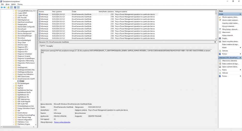 Dzień dobry, borykam się z takim problemem, iż komputer w losowych momentach odtwarza dźwięk rozłączanego urządzenia. Tak jakbym wyjął pendrive. Potrafi nawet 3 dźwięki wydać w przeciągu sekundy. Dzieje się to teraz częściej i już mnie denerwuje. Komputer pracuje tak samo jak zawsze, czyli dobrze, wszystko działa tylko ten uciążliwy dźwięk. Odkąd się to zaczęło? Nie wiem dosyć dawno ale to było jakby jednorazowe raz na tydzień potem raz dziennie, a teraz w przeciągu godziny potrafi tak z 100 razy. Znalazłem jakiś poradnik na internecie, aby uruchomić dziennik zdarzeń i mam takie coś: Lecz nic mi to nie mówi co to może być za sprzęt. W załącznikach wstawiam też logi z FRST. Pozdrawiam FRST.txt Shortcut.txt Addition.txt