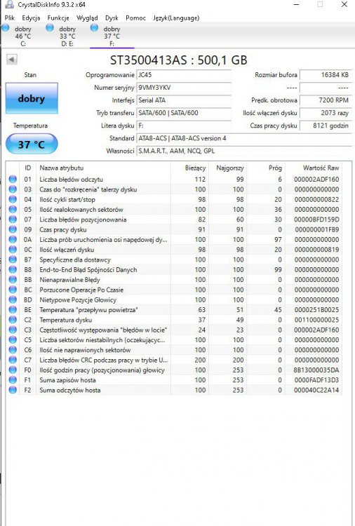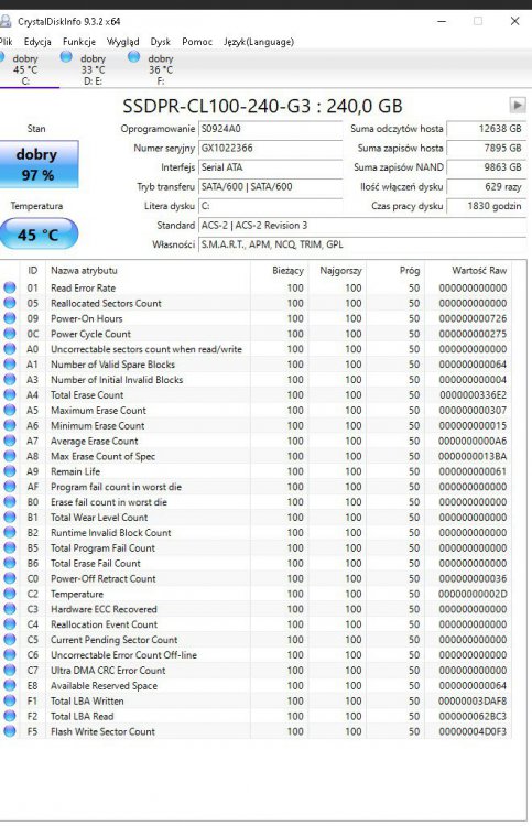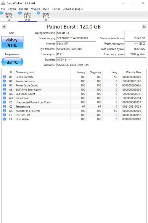 Mam podpięte 3 dyski. 2x SSD i 1xHDD SSD1 - jedna partycja systemowa C: do tego zainstalowane sterowniki oraz aplikacje np. LibreOffice czy Google Chrome SSD2 - dwie partycje D: i E: w tym momencie jest tam tylko jedna gierka + nakładka do niej HDD - partycja F: w tym momencie pusta Rozważałem problem z dyskiem, dlatego wszystko zainstalowałem na SSD dla testów i nie widać poprawy. Wklejam screeny z aplikacji.