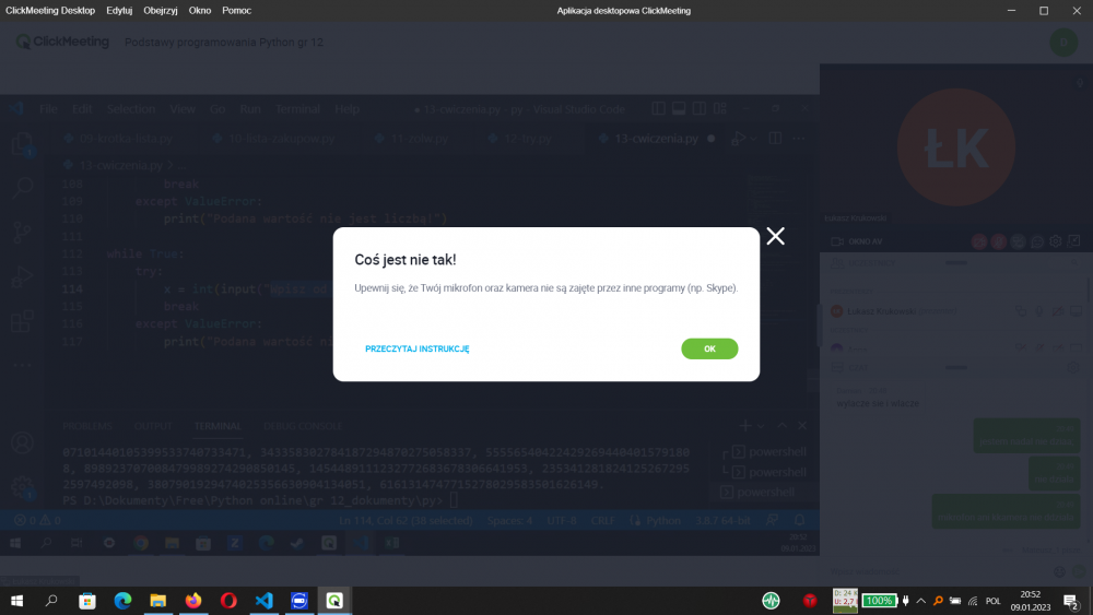 Dzień dobry, nie mogę sobie poradzić z problemem dotyczącym programu ClickMeeting, używanego podczas szkoleń on-line. Od miesiąca biorę udział w szkoleniu za pomocą tego programu, i początkowo wszystko działało dobrze, kamera i mikrofon włączały się. Niestety, od dwóch zajęć występuje problem z włączaniem się kamery i mikrofonu. Gdy klikam przycisk, za pomocą którego chcę włączyć kamerę lub mikrofon, program wyświetla komunikat, który umieściłem w Załączniku. Problem występuje również w przeglądarce Firefox i Opera, w tym samym szkoleniu. System to Windows 10. Poza tym, zauważyłem, że został zainstalowany program "pontiac-powerseller", którego ikonę mam na pulpicie. Tak na marginesie, występuje też problem z aktualizacjami systemu Windows 10. Moim zdaniem, te wszystkie problemy są powiązane. Addition.txt FRST.txt Shortcut.txt