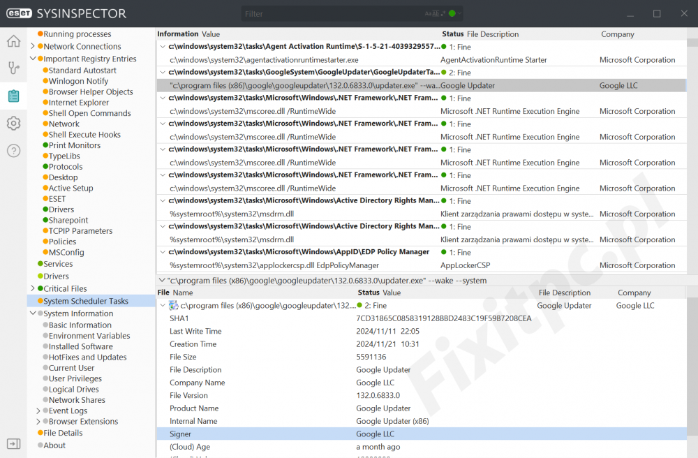 ESET SysInspector Strona domowa Polski plik pomocy Platforma: Windows 7 i nowsze oraz edycje serwerowe 32-bit i 64-bit Licencja: freeware W aktualnej wersji 2.0.17.0 (wydanej pod koniec 2023) zmienił się interfejs, co zaprezentowane na zrzucie, a także usunięto funkcjonalność porównywania raportów oraz tworzenia skryptu usuwającego. ESET SysInspector - Narzędzie do analizy komponentów systemu, integrowane również w produktach ESET Smart Security i NOD32. W skład rozpoznawanych obiektów wchodzą: Running processes (aktywne procesy systemu), Network Connections (otwarte porty TCP i UDP oraz serwery DNS), Important Registry Entries (różne czułe lokalizacje rejestru oraz parametry produktów ESET w rejestrze), Services (usługi), Drivers (sterowniki), Critical Files (zawartość plików win.ini i system.ini), System Scheduler Tasks (zaplanowane zadania), File details (szczegóły plików). System information podaje zaś takie dane jak: zainstalowane programy i aktualizacje, zmienne środowiskowe, aktualne uprawnienia użytkownika, sumaryczne właściwości dysków, udziały sieciowe, rekordy z dzienników zdarzeń Aplikacja i System, rozszerzenia przeglądarek (Firefox | Chrome | Edge | IE). Lista ma wbudowaną weryfikację podpisów cyfrowych plików. Menu kontekstowe oferuje opcje otworzenia lokalizacji docelowej w rejestrze lub na dysku. SysInspector wykorzystuje technikę Anti-Stealth umożliwiającą wykrywanie ukrytych obiektów (np. rootkitów) w procesach, usługach, rejestrze i MBR. Aplikacja ma wbudowany system oceny komponentów w skali 1-9, kolory sugerują poziom bezpieczeństwa, a widok może zostać przefiltrowany do pokazywania tylko obiektów określonej skali zagrożenia. Skalę kolorystyczną należy brać z lekkim przymrużeniem oka. Przeważnie wyniki typu "Unknown" należy interpretować, że aplikacja nie ma ich po prostu w bazie i nic więcej. Podczas pierwszego uruchomienia pada pytanie czy utworzyć raport na własny użytek, czy też zanonimizowany pod potencjalną przesyłkę do analizy przez eksperta. Wyniki skanowania można przerzucić do logów *.esil (format własny), *.json lub *.zip. Program w zakresie dla przeciętnego użytkownika ogranicza się do pobrania informacji i ich zapisu do logów. Brak funkcji usuwających. Do pobrania są odrębne edycje 32-bit i 64-bit. Program nie wymaga instalacji. W menu można ustawić polski oraz ciemny motyw.