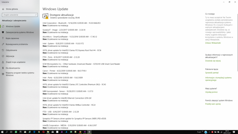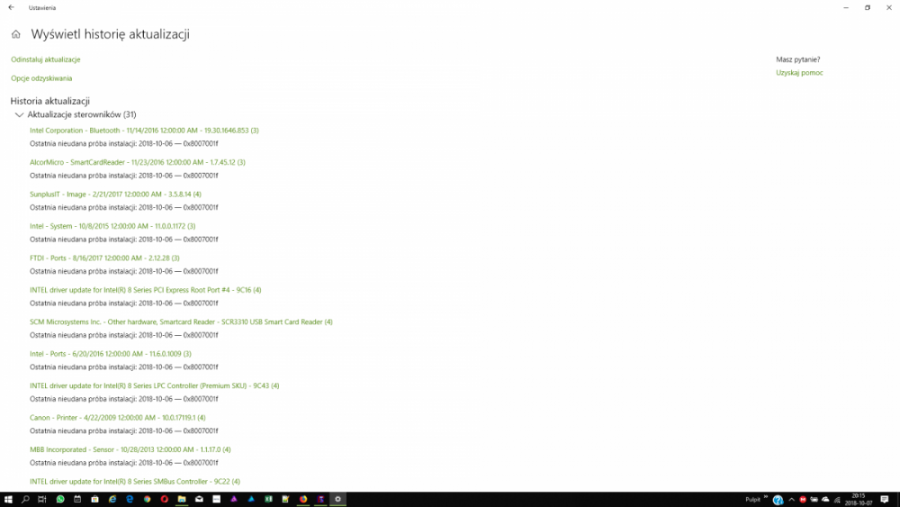 2. Witajcie, Tracę powoli nadzieję że uda się go usprawnić bez reinstalacji Windowsa, ale że nadzieja umiera ostatnia to proszę o pomoc. Od paru dni, dokładnie od 5 zauważyłem że z komputerem zaczęło dziać się coś dziwnego. Urządzenia podłączane pod usb przestały działać choć jeszcze chwilę wcześniej działały bez problemu, próba instalacji sterowników kończy się niepowodzeniem albo z powodu "Instalator napotkał nieznany błąd" albo brak możliwości uzyskania dostępu do pliku lub jeszcze inne których nie zapamiętałem. Kolejny objaw jaki się pojawił to przestał działać Windows Update i wisi w nim instalacja sterowników do chyba większości sprzętu w komputerze ale każda próba aktualizacji kończy się fiaskiem. Błędy jakie się pojawiają to: 2018-‎10-‎06 — 0x8007001f 2018-‎10-‎06 — 0x800703f1 ‎2018-‎10-‎06 — 0x80246007 Na to wszystko w dniu wczorajszym zaczął sypać się jeszcze antywirus a na chwilę obecną (po reinstalacji) w ogóle już nie działa. Podpowiedzcie proszę czy jest jeszcze dla niego nadzieja bo już powoli nie mam pomysłów co robić. Raport z monitora systemu: https://1drv.ms/u/s!Ai2xbMkAvcq45U96u_J8tayrLjgF Addition.txt FRST.txt Shortcut.txt
