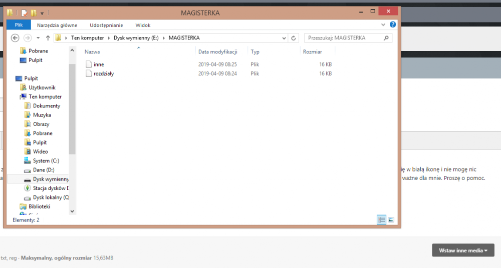 1. Dzień dobry, Mam duży problem - na pendrive posiadam 4 foldery z podfolderami i luźnymi plikami. Jeden z folderów - bardzo ważny dla mnie miał 2 podfoldery - rozdziały i inne. Jak w niego wchodzę to sama ikona zamieniła się w białą ikonę i nie mogę nic otworzyć. Otwiera mi się tylko okno aby wybrać program do otworzenia a samych plików worda nie ma. Czytałam o tym i wygląda mi na to, że te foldery pozamieniały się w skróty? Czy da się to naprawić? To bardzo ważne dla mnie. Proszę o pomoc. A i próbowałam z pokazywaniem folderów ukrytych - niestety nic nowego się nie pojawiło. W załączeniu screen jak to wygląda. Dodaje logi z FRST. FRST.txt Addition.txt Shortcut.txt