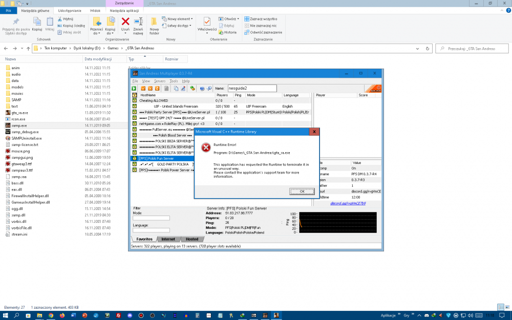 Jak w temacie. Miesiąc temu działał mi jeszcze San Andreas Multiplayer (SA-MP), nic nie wskazywało na to, że coś się dzieje... Dzisiaj 14 listopada 2022 chciałem uruchomić SA-MP, ale wyskoczył błąd. Testowałem na ZMODYFIKOWANYM GTA San Andreas, dostawałem crash aplikacji samp.exe, testowałem na CZYSTYM GTA San Andreas bez żadnych modyfikacji, screen błędu poniżej. Używam najnowszej aktualizacji w Windows 10, nie wiem co jest przyczyną tego błędu... Szukałem rozwiązania w internecie, NIC a NIC... Co zrobiłem? 1) Reinstall wszystkich bibliotek Microsoft Visual C++ od 2005 do 2022, błąd nadal występuje. 2) Próbowałem uruchomić samp.exe z uprawnieniami administratora (to samo plik gta_sa.exe), błąd nadal występuje. 3) Próbowałem uruchomić samp.exe i gta_sa.exe w trybie zgodności (Testowałem: Win XP SP3 i Win 7), błąd nadal występuje. 4) Reinstall GTA San Andreas i SA-MP, błąd nadal występuje. San Andreas Multiplayer (SA:MP) – modyfikacja gry komputerowej Grand Theft Auto: San Andreas, umożliwiająca grę wieloosobową za pośrednictwem Internetu lub sieci LAN. Umożliwia grę do 1000 osób na jednym serwerze. Nie jest open-source, w przeciwieństwie do Multi Theft Auto. Aby korzystać z tej modyfikacji, wymagana jest gra Grand Theft Auto: San Andreas w wersji 1.0. Błąd: Runtime Error! Program D:\Games\_GTA San Andreas\gta_sa.exe This application has requested the Runtime to terminate it in an unusual way. Please contact the application's support team for more information. Addition.txt FRST.txt Shortcut.txt -