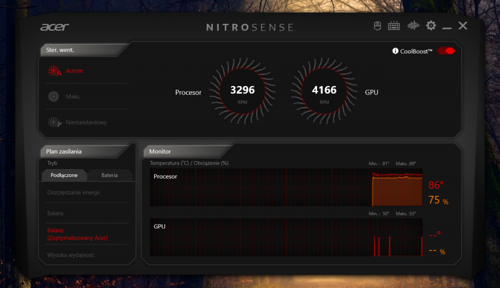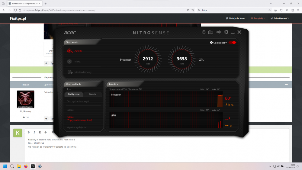 2. Kupiony w zeszłym roku w wrześniu. Acer Nitro 5 Nitro AN517-54 Od razu jak go włączyłem to zaczęło się to samo z obciążeniem i temperaturą. Screen zrobiony teraz. Lapek stoi na dobrej podkładce, nie jest kładziony na koce, kolana itp. Nigdy nie było takiego czegoś temp oscylowała na podkładce koło 38 - 40 stopni