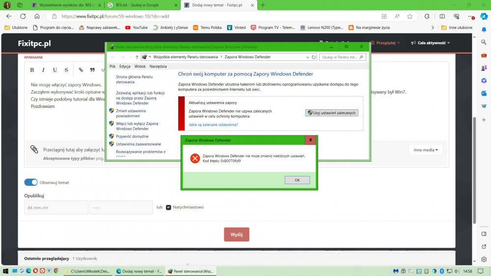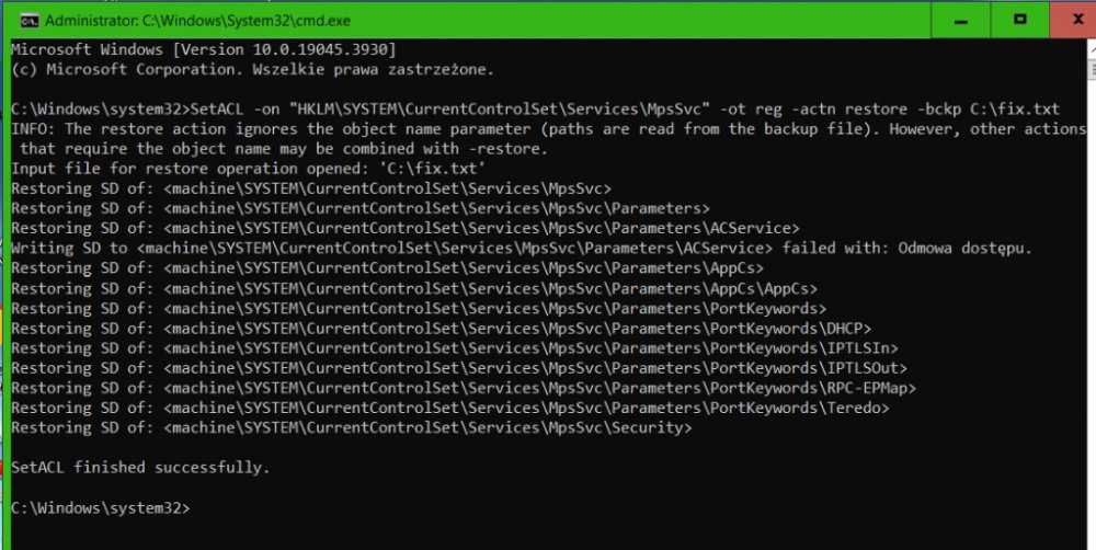 Nie mogę włączyć zapory Windows - screen w załączniku. Zacząłem wykonywać kroki opisane w tutorialu "Rekonstrukcja Zapory systemu Windows" ale wyskakiwały błędy i rezultaty były inne niż w "tutku" - może dlatego, że tam opisywany był Win7. Czy istnieje podobny tutorial dla Windows 10? Pozdrawiam Chciałem tylko dodać, że komputer coraz bardziej zwalnia a z SysTrya zniknęła ikonka Defendera. W powiadomieniach mam ciągle zalecenie żeby uruchomić Zaporę Windows ale po kliknięciu się nie uruchamia...