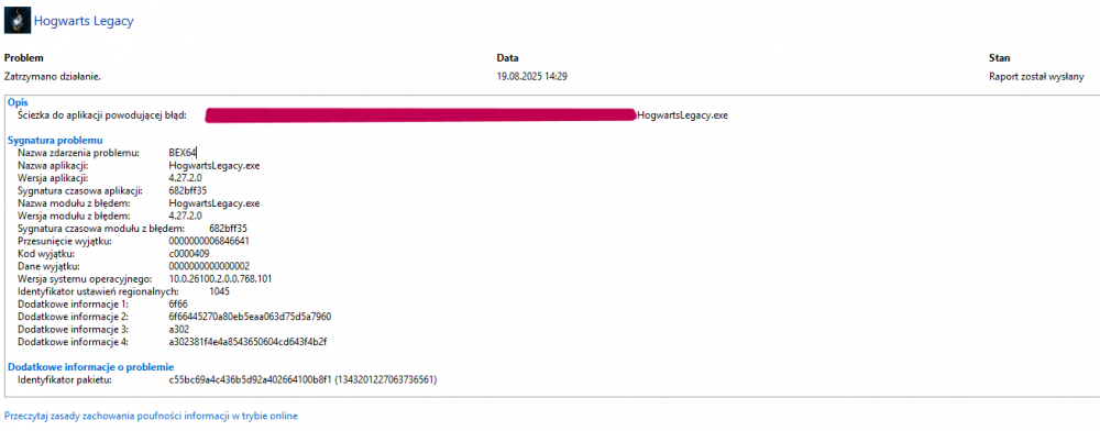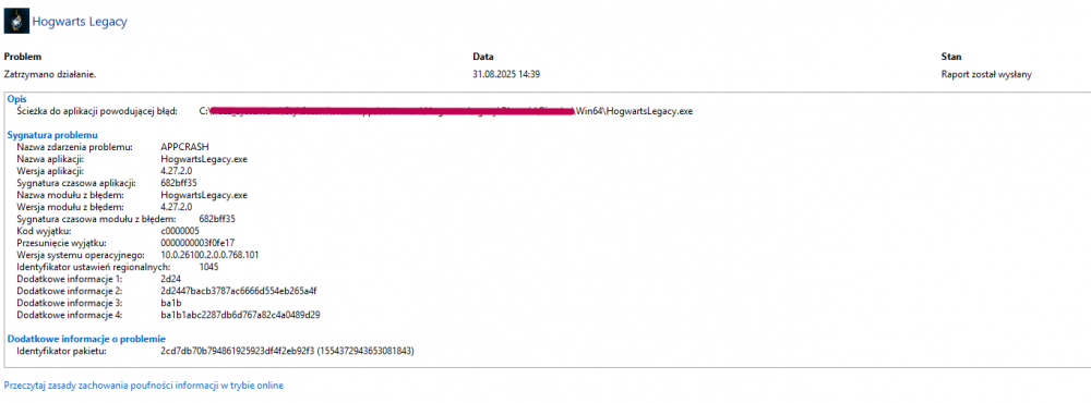 Potestowałem grę po tych zmianach i przez ponad 27 godzin grania nie było z niczym problemu. Dokładnie wczoraj gra miała crash. Co ciekawe nie jest to błąd BEX64, a najbardziej klasyczny z możliwych, czyli APPCRASH. Same awarie gry zdarzają się dosyć rzadko i są bardzo losowe. Z moich obserwacji wychodzi na to, że to jest raczej problem samej gry niż komputera. Jak Nvidia wypuści jeszcze jakieś nowsze sterowniki z serii 590.xx, to wtedy jeszcze sprawdzę. Podrzucam zrzut ekranu: PS Wydaje mi się, że przeinstalowanie sterowników i pozostałych komponentów pomogło naprawić błąd BEX64, natomiast gra i tak ma swoje problemy. -