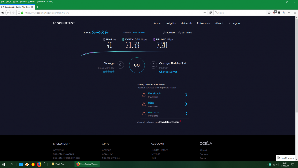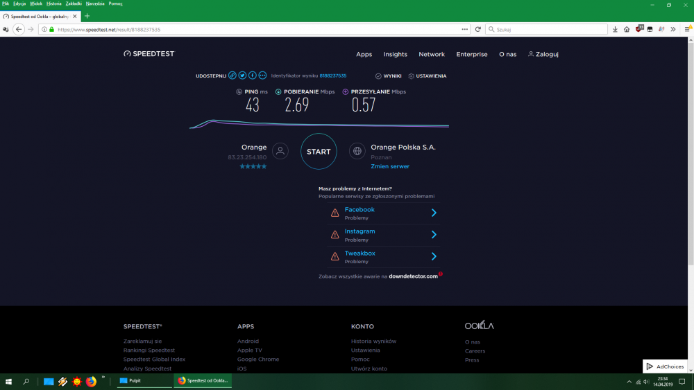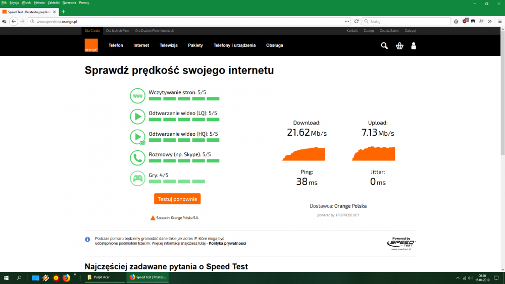 Witam, chciałbym prosić o pomoc, gdyż sam już nie wiem co jest nie tak z moim laptopem lub internetem. Korzystam z internetu orange przez wifi (router funbox 2.0 jest w drugim pokoju). Z niewyjaśnionych dla mnie przyczyn raz internet chodzi dobrze (ok 20mb/s predkosc pobierania, bo taki mam max na linii), a raz predkosc spada prawie do zera. Czasem pomaga restart laptopa lub routera, ale nie zawsze, czasem mimo restartow ta predkosc utrzymuje sie caly czas na minimalnej ilosci. Ciekawostką jest fakt, że najczęściej predkosc mi spada w nocy. Mieszkam w domku jednorodzinnym, jeśli to ma jakieś znaczenie. Co moze byc tego przyczyna? Myslalem na poczatku, ze problemem jest kilka urzadzen podlaczonych do sieci przez co spada przepustowosc (mam internet 20mbs) jednak na innych urzadzeniach internet nie spada do zera, poza tym czasem mimo tych kilku dodatkowych urzadzen moj internet dziala dobrze i w testach wykazuje najwyzsze mozliwe wartosci - wiec co moze byc problemem? Laptop był pół roku temu w serwisie jednak oczywiscie zadnych bledow nie wykryli :) Technicy orange też byli nie raz w ostatnich latach i sprawdzali stan sieci i routera, niby wszystko ok. Karty sieciowie w menedzerze mam zaktualizowane, windows update tez zaktualizowany, programy niepotrzebne wylaczone. PS: Jeśli to istotne - czasem gry gram w gry, głównie np Fortnite lub Overwatch, to gdy internet się chrzani to mam gigantyczny skok "packet loss", nawet na poziomie 30% Addition.txt FRST.txt Shortcut.txt