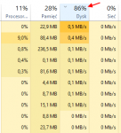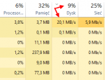 Może warto by się zastanowić, czym tak naprawdę jest raportowane przez Task Managera użycie dysku. Tak na chłopski rozum, powinno to mieć związek z ilością przerzucanych (odczytywanych/zapisywanych) na dysku danych. A teraz spójrzcie na zrzuty poniżej: Przy blisko 90% użyciu dysku dwa najbardziej zasobożerne procesy zabierają zaledwie 0,9 MB/s, reszta procesów to w ogóle jakieś drobne. Na drugim obrazku z kolei widać proces zużywający 20 MB/s, co przekłada się na niecałe 10% użycia dysku. Domyślam się, że w użyciu dysku nie chodzi wcale o transfer danych, ale o czas pracy głowic np. przy indeksowaniu dużej liczby małych plików.