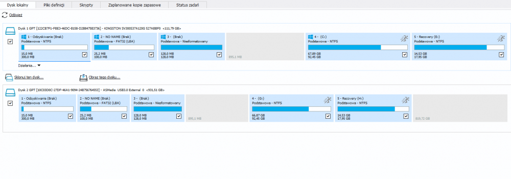 Witam ponownie, Myślę ,ze można powoli finiszować z wątkiem , operacja zakończona sukcesem. Trochę refleksji; posłużyłem się próbna wersja programu Macrium Reflect Home na podstawie powyższego filmu. Teraz takie programy do klonowania, głownie systemu, są w większości płatne. Bardzo przejrzysty program , czy godny polecenia niech się wypowiedzą fachowcy. Kilka pytań końcowych zgodnie z załączonymi obrazami: - czy mogę scalić te mniejsze partycje ? Sklonowałem tak jak ktoś tu wcześniej grzebał , ja nic nie wiem dlaczego tyle tych podziałów. - Czy mogę uznać, ze klonowany dysk jest od razu kopia zapasowa ? Ten proces chyba nie przeszedł pomyślnie ( backup się nie udał bo był wybrany albo dysk D - który nie był przydzielony albo dysk C , gdzie nie mogło być miejsca , jeśli rozumiem kopia zapasowa tworzy się 1: 1 jeśli chodzi o objętość) ). To znaczy ze muszę kopie zapasowa przetrzymywać na innym jeszcze dysku w razie awarii i ten backup będzie objętości ok. 100 G jak ten klonowany dysk , czy będzie jakaś kompresja?