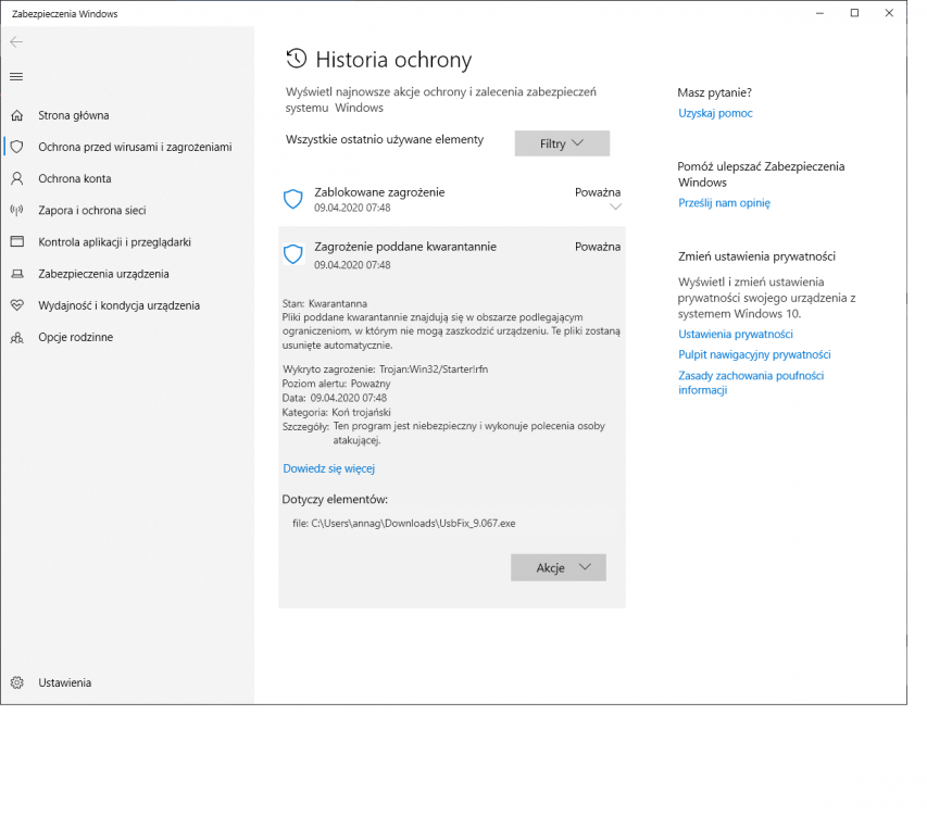 Zgodnie ze wskazówką Krzesimierza zgłosiłam się do supportu wp.pl. Otrzymałam odpowiedź z automatu, która nijak ma się do mojej sytuacji... Pliki przesyłałam pośrednio za pomocą narzędzia wetransfer za każdym razem do współpracowników pracujących stacjonarnie, na komputerach służbowych. Ponieważ od jakiegoś czasu maile z wetransfer wpadają do spamu, a w pracy nie mamy dostępu do zawartości foldera spamowego, przesyłałam pliki przez wetransfer do siebie na konto prywatne, aby w mailu otrzymanym z wetransfer uzyskać link do downloadu plików. Następnie ten link wklejałam w treść maila służbowego (pracuję zdalnie na koncie służbowym, nie wysyłam nic do współpracowników z moich kont prywatnych). Zrobiłam tak kilka razy. Tylko w jednym przypadku koleżanka zgłosiła mi, że nie może otworzyć plików z linku, ponieważ antywirus zainstalowany na jej komputerze służbowym zgłosił, że w plikach znajduje się wirus i usunął całe archiwum. I tu pojawia się problem, ponieważ pracodawca zezwala na pracę zdalną na komputerze prywatnym pod warunkiem spełnienia przez ten komputer warunków bezpieczeństwa. W innym przypadku komputer zostanie permanentnie zablokowany i praca zdalna nie będzie możliwa. Dodam jeszcze, że pliki, które przesyłałam, znajdują się na innym pendrivie niż ten, na którym widać pozostałości po infekcji. Niestety nie umiem powiedzieć dokładnie. Natomiast zdziwiło mnie, że zachowały się jakiekolwiek pliki na dysku D i foldery i/lub pliki aplikacji, które nie są wbudowane w Win 10 a które gdzieś tam po drodze zainstalowałam, pracując jeszcze na Win 7. Dołączam raport z USBFix (opcja "Scan usb discs"). Które z wymienionych plików mam zaznaczyć do usunięcia? Czy przedstawić z tego programu jakieś screeny, logi, informacje? UsbFix-Report-01.txt -